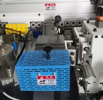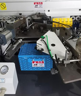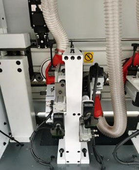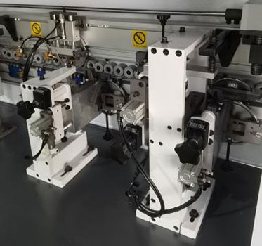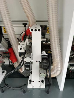 根據(jù)斜邊板材角度設(shè)計,上平刀下跟蹤刀,修至封邊帶緊貼板邊。氣缸進退,切換自如。 |