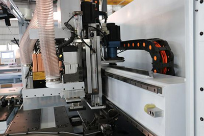 側(cè)靠裝置,根據(jù)板材寬度自動(dòng)調(diào)節(jié)側(cè)靠位置,避免工件高速運(yùn)動(dòng)時(shí)的工件側(cè)面的磨損,適應(yīng)不同寬度板材加工需要,達(dá)到最佳鉆孔效果。  |